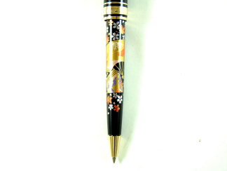 蒔絵で描かれた扇面と桜ともみじを描いた漆器のボールペンです。