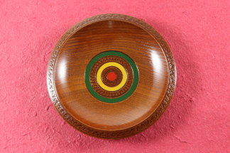 欅 茶托 独楽塗は、国産欅の茶托に摺漆を塗ってから刷毛で緑と黄色と朱の漆を塗ってあります。